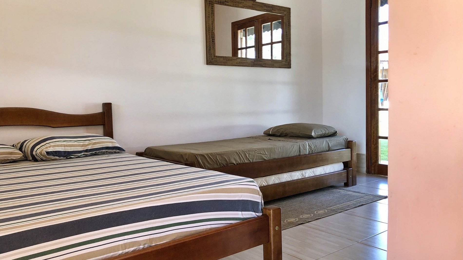 Suíte 2: 1 cama de casal + 1 cama de solteiro + 1 cama auxiliar, acomodando até 4 pessoas. Suíte 3: 1 cama de casal + 1 cama de solteiro + 1 colchão extra, acomodando até 4 pessoas. Suíte 4: 1 cama de casal + 1 cama de solteiro + 1 colchão extra, acomodando até 4 pessoas.