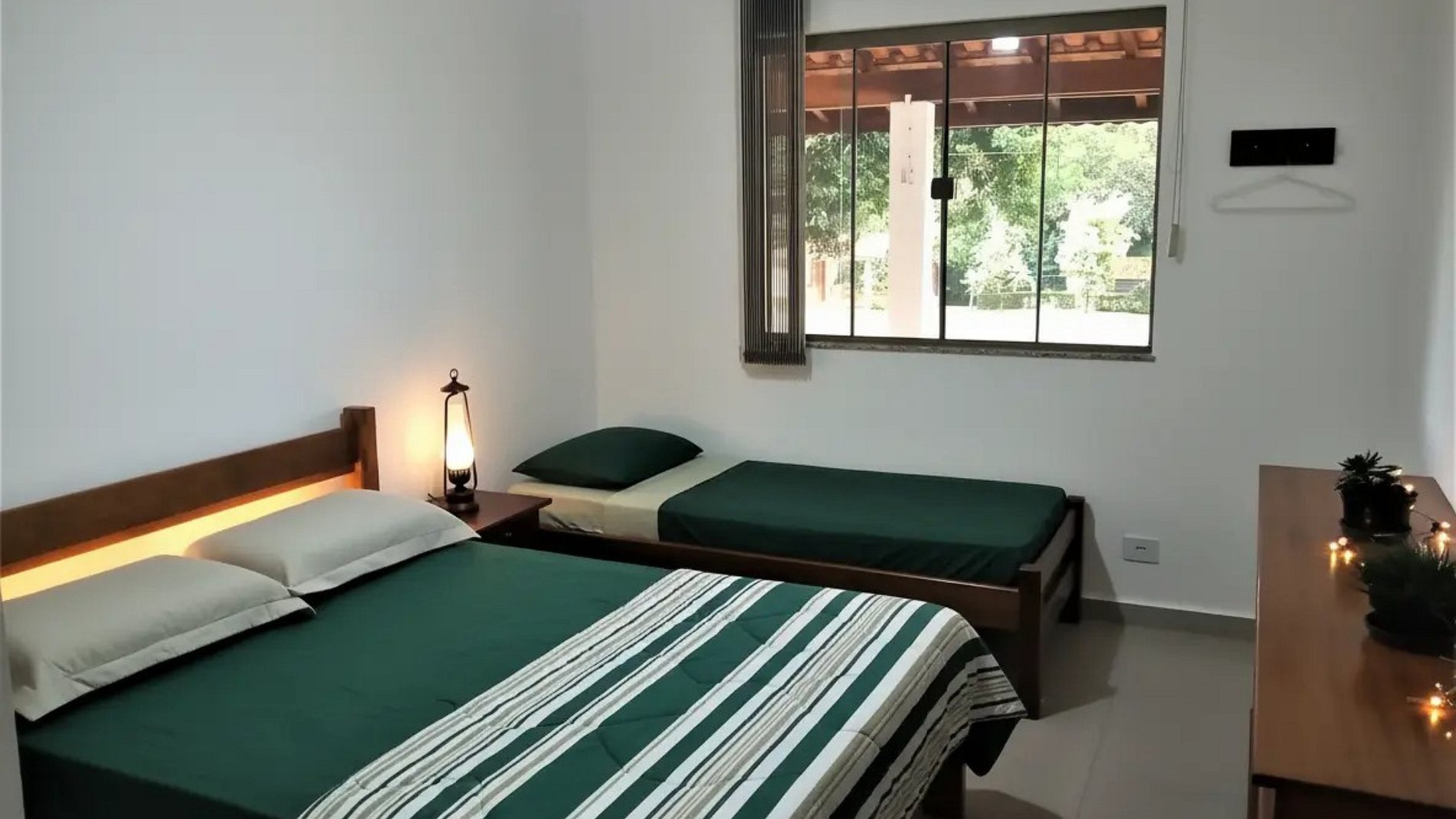 ACOMODAÇÕES CONFORTÁVEIS: Nossos quartos são projetados para acomodar até 13 pessoas com conforto e privacidade: Quarto 1: 2 camas de solteiro, até 2 pessoas. Quarto 2: 2 camas de solteiro, até 2 pessoas. Quarto 3: 2 camas de solteiro, até 2 pessoas. Quarto 4: 2 camas de solteiro, até 2 pessoas. Quarto 5: 1 cama de casal king, até 2 pessoas. Quarto 6: 1 cama de casal + 1 cama de solteiro, até 3 pessoas. Colchões extra disponíveis para maior flexibilidade.